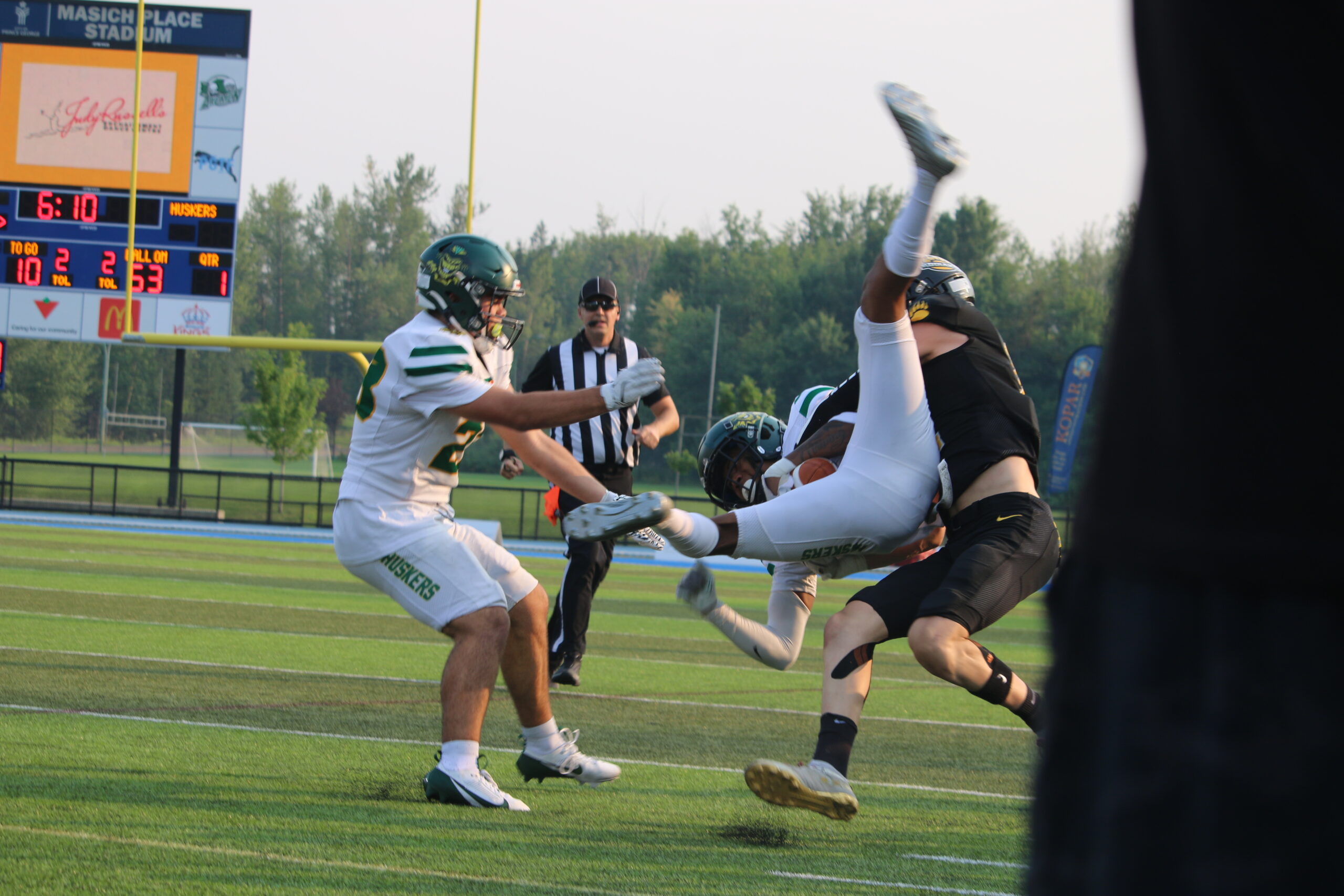 The Kodiaks gave the ball away three times, as Thiessen threw two interceptions, and Carson Briere had the ball ripped out of his hands by a Husker defensive back on a strip.