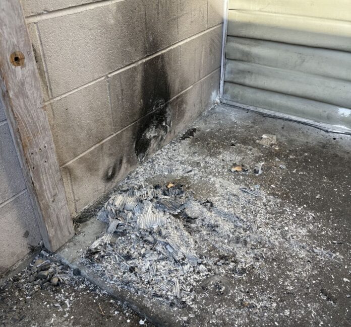 Through email, Foley shared photos from the downtown restaurant last week, showing a pile of ash and a burn mark outside of the back door, as well as a smaller pile of ash at the front door.